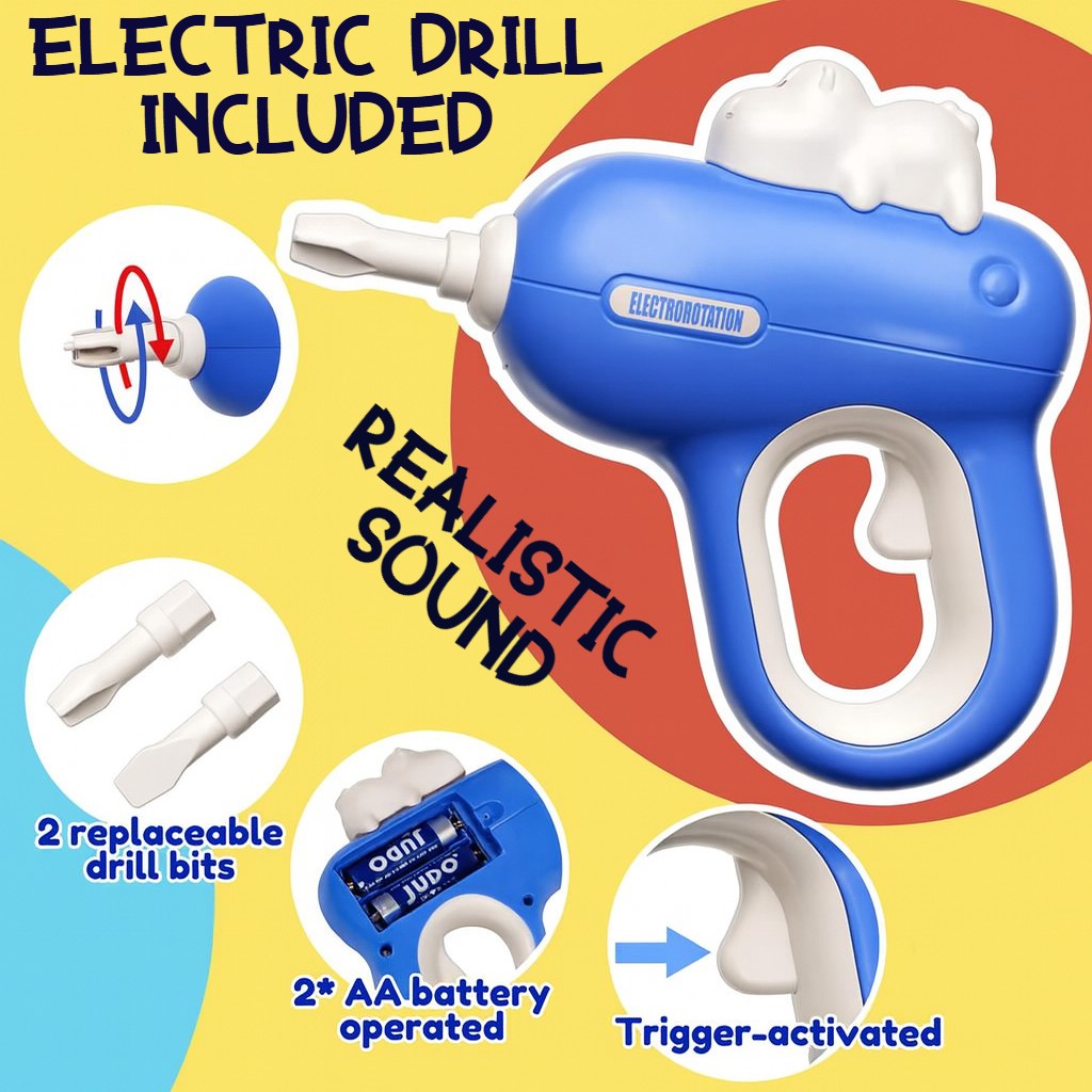 Realistic electric drill powered by 2×AA batteries (not included) for authentic building fun.