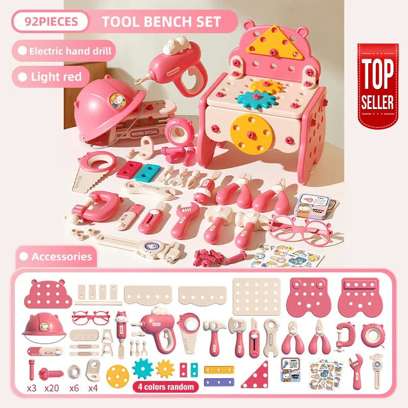 Let your little builder explore, create, and learn with this adorable pink tool kit packed with 80+ pieces — from screwdrivers and drills to gears and bolts.